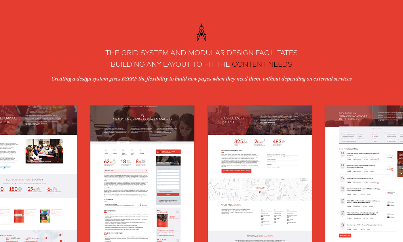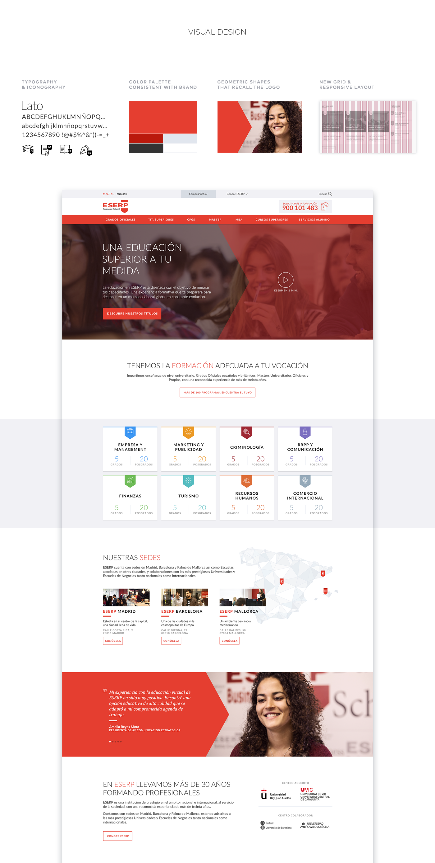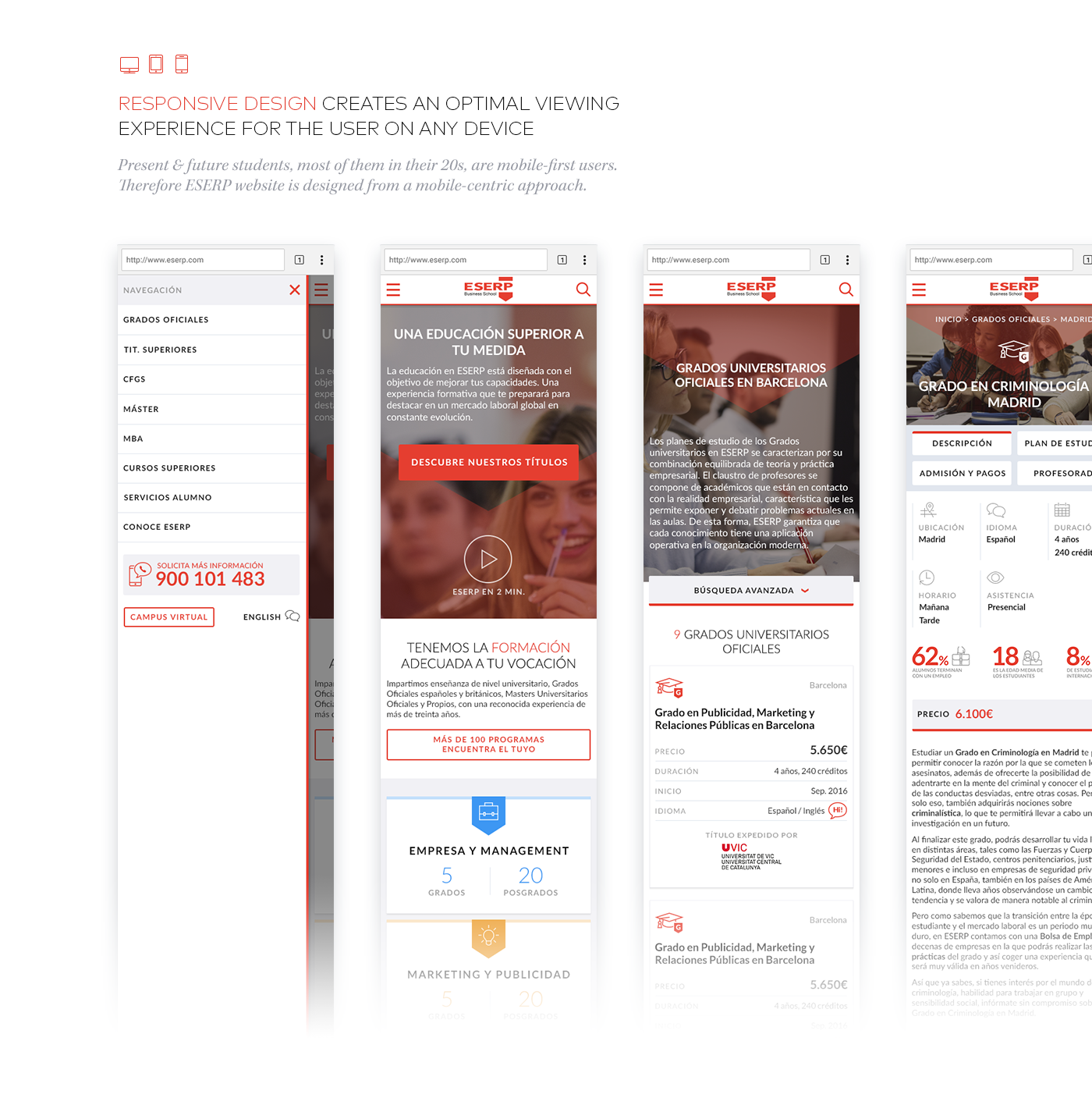 On the visual design, the grid system and modular design facilitates building any layout to fit the content needs. Creating a design system gives ESERP the flexibility to build new pages when they need them, without depending on external services. Responsive design creates an optimal viewing experience for the user on any device. Present & future students, most of them in their 20s, are mobile-first users. Therefore ESERP website is designed from a mobile-centric approach.